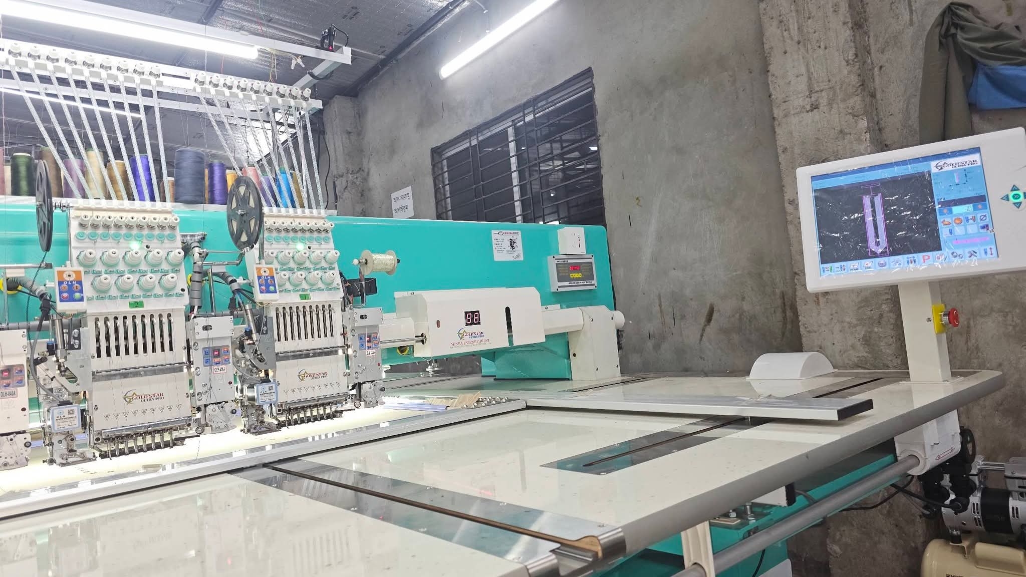 Taken from a lower angle, this image captures the human element behind industrial textile manufacturing. Two technicians are crouched and actively working beneath the massive embroidery machine’s table. Their positioning indicates they are likely performing routine maintenance, mechanical calibration, or under-thread bobbin adjustments required to keep such a large piece of synchronized machinery running smoothly.