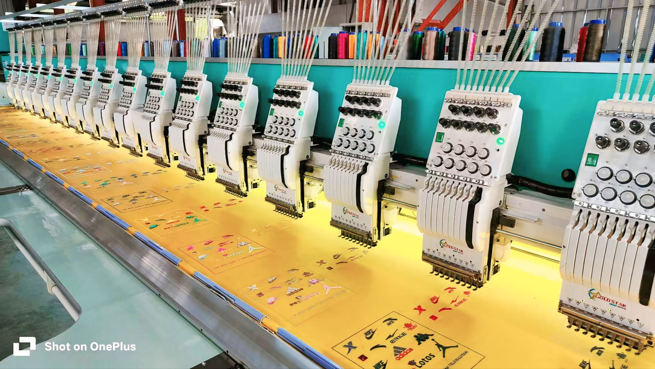 A wide perspective shot showcasing a massive, heavy-duty Gold Star industrial embroidery setup in a factory environment. The photo captures dozens of synchronized operating heads equipped with specialized transparent top attachments (likely for specialty threads, beads, or sequins). The expansive, highly reflective work table illustrates a configuration built for large-scale, continuous textile decoration.