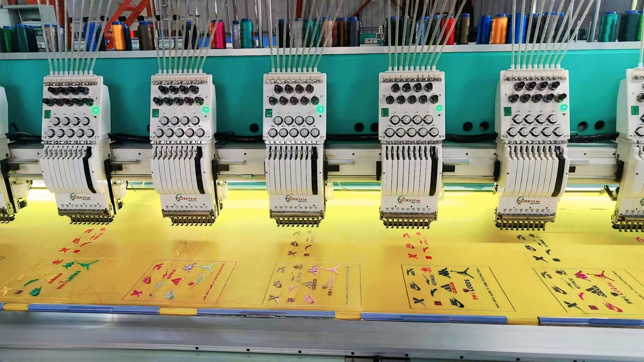 A detailed macro shot captures a single Gold Star Max Pro embroidery head actively stitching a red geometric pattern onto a bright yellow fabric. Notably, a red circle has been hand-drawn onto the image, highlighting a specific area near the upper right thread tensioners and a yellow-ringed port on the machine’s green casing. This annotation suggests the image was likely taken to point out a specific part for maintenance, repair, or adjustment.